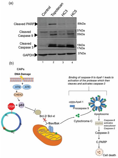 The release of cytochrome c in the cytoplasm forms apoptotic initiator complexes that activate the caspase cascade [46]. Upon CAPs treatment in WERI-Rb1 cells, we observed the activation of caspase 9 with the presence of a cleaved protein sizes of 37 kDa and 35 kDa (Figure 7a). No cleaved bands were observed in the control, while topotecan treatment conditions showed cleaved caspase 9 (Figure 7a). CAPs also cleaved caspase 3 with protein sizes of 19 kDa and 17 kDa in the immunoblot (Figure 7a) while control cells did not exhibit activation of caspase 3 (Figure 7a). Activation of caspase complex inhibited the DNA repair enzyme PARP, displaying a cleaved protein band size of 89 kDa upon CAPs and topotecan treatment (Figure 7a). Thus, activation of apoptotic initiator complex caspase 9 further activated the caspase 3 executioner complex downstream and caused irreversible cell death (Figure 7b).