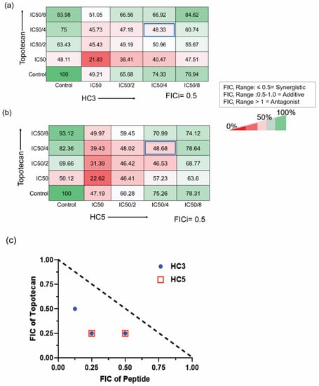 CAPs exhibit synergism with topotecan (a) Checker-board assay showing the drug interaction of HC3 with topotecan. FICi values were 0.5. (b) Checkerboard assay showing the interaction of HC5 with topotecan. (c) Isobologram showing the changes in the fraction of IC50 values for the combined drugs. The broken line represents the hypothetical additive effect. The Fractional Inhibitory Concentration Index (FICi) was determined by the combined FIC value for each peptide and topotecan (FICi = FIC of peptide + FIC of topotecan). FICi value of ≤0.5 was considered synergistic; a value of >0.5–1 indicated an additive effect of the two drugs, and a FICi value of >1 indicated antagonism. FICi values of HC3 and HC5 with topotecan are ≤0.5. Values represent the mean of percent viability.