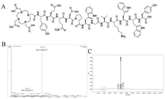 (A) The structural formula of DOTA-M2pep. Mass spectrometry (B) and HPLC (C) results for DOTA-M2pep.