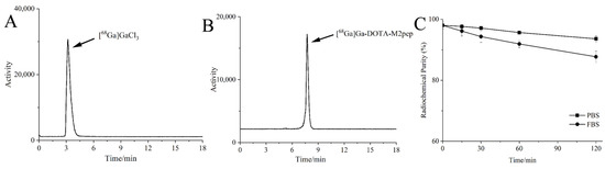 [68Ga]Ga-DOTA-M2pep was generated with a radiochemical purity of 98 ± 1.15% under heating at 55 °C for 30 min and used without further purification. The specific activity and the molar activity of the radiolabeled peptide were 0.24–0.33 MBq/μg and 0.20–0.27 MBq/μmol, respectively. As displayed in Figure 2, the retention time of [68Ga]Ga-DOTA-M2pep on radio-HPLC was 8.3 min. The [68Ga]Ga-DOTA-M2pep was stable, and the radiochemical purity was still over 90% and 85% in PBS and FBS after 2 h of incubation, respectively.