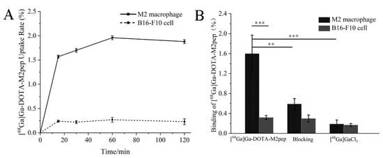 (A) Uptake of [68Ga]Ga-DOTA-M2pep in macrophages and B16F10 cells. (B) Competitive binding assay of [68Ga]Ga-DOTA-M2pep in macrophages and B16F10 cells (** p < 0.01, *** p < 0.001).