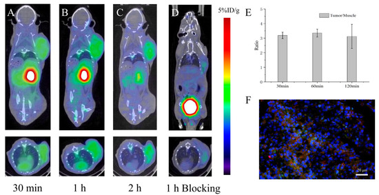 Micro-PET scans were performed at 30 min, 1 and 2 h following injection of [68Ga]Ga-DOTA-M2pep. The coronal and transverse PET/CT images showed an obvious uptake of the radiolabeled tracer in tumor tissues (Figure 4A–C). The blocking scan demonstrated mild radiotracer uptake at 1 h post-injection of [68Ga]Ga-DOTA-M2pep (Figure 4D). Significant accumulation of [68Ga]Ga-DOTA-M2pep was also visualized in the kidneys and bladder over time, while low accumulation was detected in the liver, which indicated that [68Ga]Ga-DOTA-M2pep was mainly excreted via the urinary system. Quantitative analysis revealed that the uptake values of [68Ga]Ga-DOTA-M2pep in B16F10 tumor at 30 min, 1, and 2 h were 2.72 ± 0.07, 2.93 ± 0.20, and 2.47 ± 0.13 %ID/g, respectively. The tumor/muscle ratios at 30 min, 1 h, and 2 h were 3.19 ± 0.22, 3.35 ± 0.27, and 3.12 ± 0.83, respectively (Figure 4E). Injection of a large excess of free M2pep resulted in a significant reduction to 1.23 ± 0.13 %ID/g in tumors (p < 0.001), suggesting that M2pep blocked the specific targeting of [68Ga]Ga-DOTA-M2pep to TAMs. In vitro immunofluorescence staining confirmed the expression of M2 TAMs in B16F10 tumors and the specificity of [68Ga]Ga-DOTA-M2pep targeting M2 TAMs (Figure 4F).