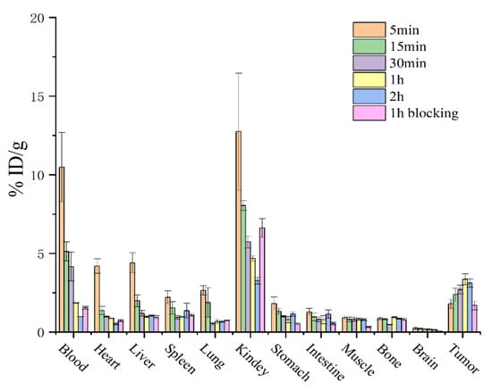 The biodistribution of [68Ga]Ga-DOTA-M2pep at different time points in B16F10 tumor-bearing mice is shown in Figure 5, which was consistent with the micro-PET imaging results. Fast clearance of [68Ga]Ga-DOTA-M2pep from blood was observed, with a blood uptake of 10.48 ± 2.20 %ID/g at 5 min and 1.84 ± 0.02 %ID/g at 60 min after injection. The highest uptake of tracer was found in the kidney, which peaked at 5 min (12.74 ± 3.71 %ID/g) and then decreased by more than 50% at 1 h. A relatively low accumulation of tracer was found in the liver, with an uptake value of 0.96 ± 0.02 %ID/g at 1 h post-injection. In addition, relatively lower levels of activities were detected in the brain, stomach, intestines, spleen, and bone. Moreover, the uptake of [68Ga]Ga-DOTA-M2pep in tumors was highest at 1 h, with an uptake value of 3.35 ± 0.34 %ID/g, which then decreased to 3.12 ± 0.27 %ID/g at 2 h. In the blocking group, the uptake of [68Ga]Ga-DOTA-M2pep decreased in B16F10 tumors from 3.35 ± 0.34 %ID/g to 1.69 ± 0.28 %ID/g (p < 0.01). In addition, the activity in the blood and tissues were found to be similar in normal and blocking groups at 1 h post-injection of [68Ga]Ga-DOTA-M2pep, which demonstrated the similar metabolic features of the tracer in vivo (Figure 5).