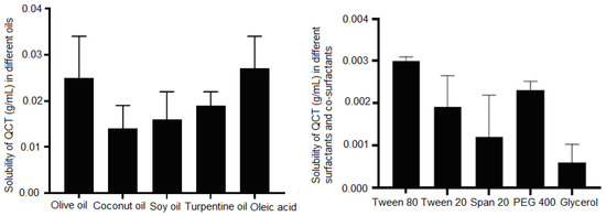 The saturation solubility method was used for the determination of QCT solubility in various oils (olive oil, coconut oil, soy oil, turpentine oil) and surfactants (PEG 400, tween 80, and Transcutol HP) [15]. A measured excess of QCT was added in a glass vial containing oil or surfactant solution (1% w/v), sealed and stirred continuously at room temperature at 200 rpm for 24 h. The obtained solution was then subjected to centrifugation at 3000 rpm, and supernatant was collected and diluted with methanol. QCT was quantified using the ultraviolet (UV) spectrophotometric method by measuring absorbance at 258 nm. All the experiments were performed in triplicate and the results are expressed as mean ± SD.