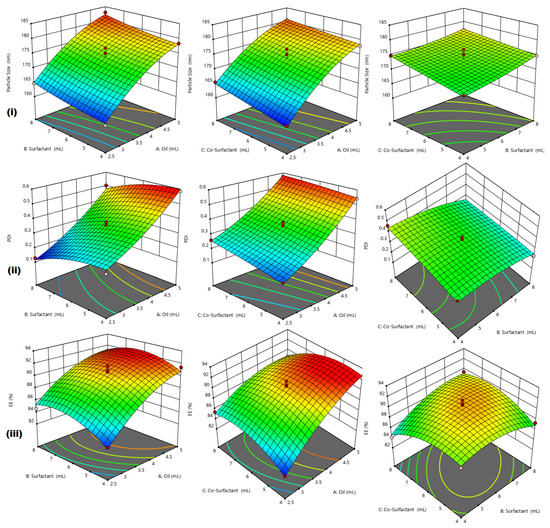 Three-dimensional plots obtained using Box–Behnken design showing effects of factors AB, BC and AC on (i) particle size, (ii) PDI and (iii) %EE.