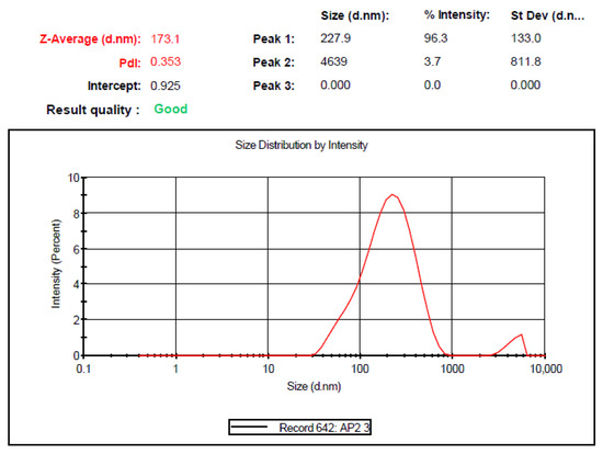 The globule size and PDI of the most optimized nanoemulsion was determined using the DLS technique, and the results are shown in Figure 3. The globule size and PDI was found to be 173.1 ± 1.2 nm and 0.353 ± 0.13, respectively. For topical delivery, the particle size needs to be less than 200 nm; therefore, the prepared nanoemulsion was deemed suitable for topical delivery. In comparison to normal emulsion, the smaller particle size of nanoemulsion also results in an increased kinetic stability [31]. It assists in preventing creaming and coalescence, as well as promoting a larger surface area and facilitating the quick transit of nanoemulsion through biological barriers.