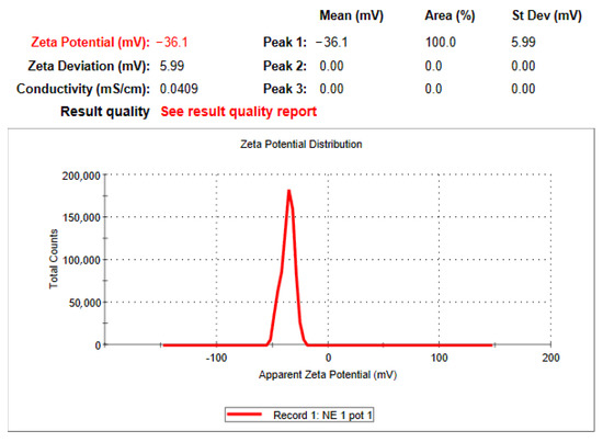 The zeta potential of optimized QCT@NE was also determined using the DLS technique and the results are shown in Figure 4. It showed negative zeta potential value of −36.1 ± 5.99 mV, which might be due to the presence of oils, which help in maintaining the interfacial boundary of the nanoemulsion droplets, leading to a better colloidal system stability. This finding was considered to be satisfactory, as particles with higher zeta potential resist aggregation, while the ones with low zeta potential tend to coagulate [32].