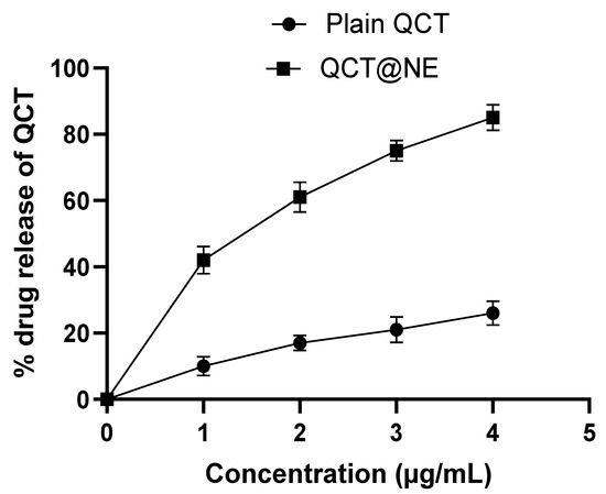 The in vitro drug release study was performed using a dialysis membrane, and the data obtained for plain QCT and the most optimized QCT@NE is shown in Figure 5. These findings revealed that 26% of QCT was released from its plain suspension and 85% from the optimized nanoemulsion within 4 h at pH 5. The higher release from the nanoemulsion was due to small globular size, which resulted in large surface area, leading to an increase in the solubility of hydrophobic drugs as well as an increase in the diffusion rate [33]. It was ascertained that the sustained release behaviour of the nanoemulsion would help in the improvement of bioavailability of hydrophobic drugs and to achieve the required therapeutic effect.