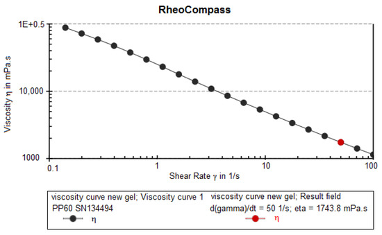 Viscosity of the optimized nanoemulgel was calculated to be 100803 ± 1234 cps. It was observed that the viscosity of nanoemulgel decreased upon increasing concentrations of triethanolamine and Carbopol 940 (gelling agent). In addition, a graph (Figure 7) was plotted between viscosity (Y-axis) and shear rate (X-axis), in which viscosity was observed to be decreased linearly by increasing the shear rate and vice versa. It was revealed that the optimized nanoemulgel exhibited non-Newtonian flow, showing thixotrophic behaviour.