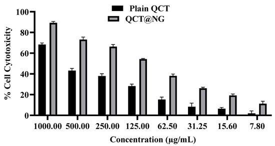 The % cell cytotoxicity studies of plain QCT and QCT@NG were performed in vitro on the human skin cancer cell lines A431 and the results are depicted in Figure 9. The findings revealed that the QCT@NG showed significantly increased cytotoxicity on A431 cancer cell lines as compared to plain QCT. This could be due to the inclusion of olive oil, which has been shown to have anti-skin-cancer properties [35]. It was also observed that % cytotoxicity was concentration- as well as time-dependent. The half-maximal inhibitory concentration (IC50) of plain QCT and QCT@NG was calculated to be 579.05 and 108.5 µM, respectively, showing excellent potential of QCT@NG for the treatment of skin cancer as compared to plain QCT.