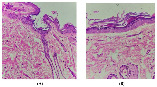 Transverse section of skin of wistar rats following skin irritation study as obtained for the (A) control and (B) QCT@NG-treated groups.