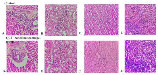 Histopathology study of QCT@NG. (A) Liver, (B) kidney, (C) heart and (D) spleen showed no significant changes in the treated group as compared to control.