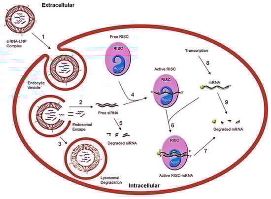 Schematic representation of mechanism of LNP-mediated siRNA delivery into cells resulting in gene silencing. The steps involve (1) LNP crossing the plasma membrane; (2) endosomal escape; (3) lysosomal degradation of LNP; (4) siRNA loading onto RISC; (5) siRNA degradation; (6) active RISC with target mRNA formation; (7) RISC cleaves the target mRNA; (8) mRNA transcription; and (9) mRNA degradation. Adopted from Ref. [28], Mol. Ther. Nucleic Acids 2017.