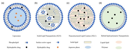 Across the pharmaceutical industry, LNPs are rapidly emerging as a promising carrier capable of delivering a wide range of therapeutic agents. As a potential carrier, the applications of LNPs are not only confined to the clinical therapeutic field but have also been extended to other fields, such as nutrition, medical imaging, cosmetics, agriculture, as well as nanoreactors [29]. Several types LNPs have been developed (Figure 1 and Figure 2) using a large number of components (Table 1) with a variety of fabrication techniques (Table 2).
