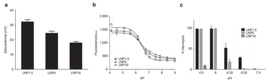 The surface coating of LNP with PEG also influences the overall surface charge on LNPs. For instance, Kumar et al. studied the effect of polyethylene glycol-1,2-dimyristoyl-sn-glycerol-3-methoxypolyethylene glycol (PEG-DMG) for shielding the LNP surface charge using 1.5% (LNP1.5), 5% (LNP5), and 10% (LNP10) PEG-DMG concentration (Figure 3). The LNPs were formulated using 1,2-distearoyl-sn-glycero-3-phosphocholine (DSPC), cholesterol, DLin-MC3-DMA. The increasing PEG-DMG concentration resulted in a decrease in zeta potential (performed at pH 5.5) which was observed to drop from +32 mV (for LNP1.5) to +24 (for LNP5) and +18 mV (for LNP10) suggesting that higher PEG-DMG reduces the surface charge density of LNP. Furthermore, the combined analysis of particle surface charge with pH titration together with haemolytic activity suggested that the high PEG density provided a more significant physical steric barrier in the inhibition of membrane fusion and disruption, as compared to the charge shielding effect property.