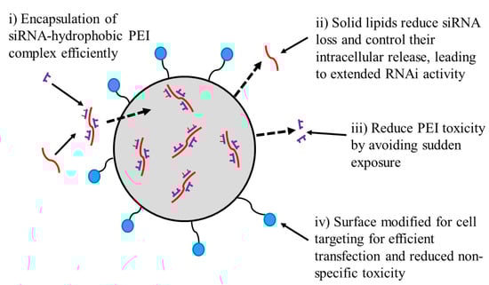 Schematic design and hypothesis of using LPNs for providing targeted, extended, and safer siRNA therapy. siRNA molecules (red) are complexed with hydrophobically modified linear PEI molecules (violet lines) which are then physically encapsulated into the core of a nanocarrier made up of solid lipids (grey). The surface groups represent the targeting moieties, e.g., phospholipids tagged with the folate group (blue).