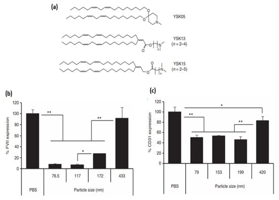 (a) Different cationic lipid structures. (b) Effect of size on the gene silencing activity in hepatocytes and LSECs. Mice were injected with siFVII formulated in various sizes of YSK13-C3-MENDs at a dose of 0.1 mg/kg and plasma FVII activities were measured in 24 h (c) Mice were injected with siCD31 formulated in various sizes of YSK15-C4-MENDs at a dose of 0.1 mg/kg and quantification of CD31 mRNA expression on LSECs in 24 h. Data are represented as the mean ± SD (n = 3). * p < 0.05, ** p < 0.01 (by one-way nrANOVA, followed by SNK test. nrANOVA, non-repeated analysis of variance; SNK, Student-Newman-Keuls. Adapted from Ref. [114], Mol. Ther. 2016.