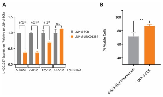 - Connerty, P.; Moles, E.; de Bock, C.E.; Jayatilleke, N.; Smith, J.L.; Meshinchi, S.; Mayoh, C.; Kavallaris, M.; Lock, R.B. Development of siRNA-loaded lipid nanoparticles targeting long non-coding RNA LINC01257 as a novel and safe therapeutic approach for t (8; 21) pediatric acute myeloid leukemia. Pharmaceutics 2021, 13, 1681. [Google Scholar] [CrossRef]