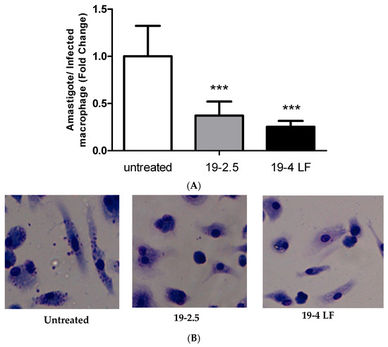 Leishmanicidal activity of 19-2.5 (1 µg/mL) and 19-4 LF (1 µg/mL) against intramacrophage amastigotes (A). Bars represent the mean ± SD values from three independent experiments. Significant reductions in the number of amastigotes per infected macrophage were detected when compared to untreated controls (***, p < 0.001). Representative images of untreated infected cells and infected macrophages treated with 1 µg/mL of 19-2.5 or 19-4LF peptides (B).