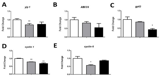 To identify the molecular mechanism involved in peptide activity, we studied the effect of 19-2.5 or 19-4LF on the expression levels of L. major genes related to drug resistance (yip1 and ABCC6) [39,40], parasite virulence (gp63) [41] and cell cycle proliferation (Cyclin 1 and Cyclin 6) [42]. To this end, the gene expression level was quantified by RT-PCR using mRNA purified from BMDM previously infected with L. major and treated with 19-2.5 or 19-4LF as a template. As shown in Figure 2, mRNA expression levels of all studied genes were downregulated in parasites exposed to 19-2.5 and 19-4LF peptides, compared to untreated parasites (control). Significant reductions (p < 0.01) were detected in (Yip1, Cyclin 1 and Cyclin 6) gene expression levels when treated with 19-2.5, while Cyclin 1 and gp63 mRNA levels were significantly decreased (p < 0.05) by 19-4LF (Figure 2).