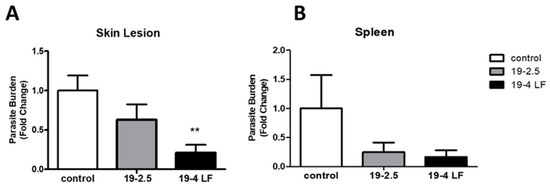 To investigate the therapeutic potential of 19-4 LF and 19-2.5 against Leishmania in vivo, we first infected mice subcutaneously and once the areas of the lesions were 12 mm2, we treated them topically with the drug candidates. Specifically, peptides were administered on the skin lesions of the animal twice a day for 30 days and parasite burden was determined by measuring the Lm18S mRNA expression levels in the skin lesion and the spleen. When compared to untreated samples (control), the parasite burden was lower in both, skin lesions and the spleen after the administration of the two peptides (Figure 3). Significant differences in parasite burden (**, p < 0.01) were detected in the skin lesion with 19-4LF treatment, compared to the control (Figure 3A).