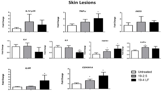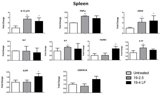 It has been demonstrated that pro-inflammatory and anti-inflammatory cytokines play a crucial role in immunity against CL inducing resistance/protection against the parasite (Th1 pro-inflammatory cytokines) and pathogen proliferation (Th2 cytokines) [43]. Therefore, four selected inflammatory cytokine genes (IL 12p35, TNFα, IL-4 and IL-6) and some of their corresponding receptors (TNFR1, Il4Rα and IL-6R) were analyzed by quantitative RT-PCR in the skin lesion (Figure 4) and the spleen (Figure 5) of infected BALB/c mice, treated with 19-2.5 and 19-4 LF (1 µg/mL) or left untreated. Two more genes were also studied, the inducible nitric oxide synthase (iNOS) whose expression is induced by cytokines [44] and the cell cycle repressor gene (CDKN1A) [45]. Gene expression analyses in the skin lesion of infected BALB/c mice, showed an induction of Th1 cytokine (IL12p35 and TNFα) and iNOS gene expression levels when treated with 19-2.5 and 19-4 LF peptides. A significant variation was detected for TNFα expression levels (*, p ≤ 0.05 compared to control) when the mice were treated with 19-4 LF (Figure 4). After analyzing the spleens of mice treated with peptides, significant inductions in IL12p35 and iNOS mRNA levels were detected with both treatments, as well as in TNFα gene with 19-2.5 (Figure 5). IL-4 and IL-6 (Th2 cytokines) gene expression levels were not altered either in skin lesions or in spleens after the treatment with 19-2.5. In fact, the IL-6 mRNA level augmented only in the spleen after treatment with 19-2.5 peptide (*, p < 0.05) (Figure 5). On the contrary, in skin lesions of 19-4LF treated mice, a decrease in expression levels of Th2 cytokines was detected. Such a reduction was very significant (**, p < 0.01) for IL-6 (Figure 4), while no significant change was observed in the spleen of the 19-4LF-treated mice for both IL-4 and IL-6. Regarding cytokine receptors, TNFR1, IL4Rα and IL6R expression levels tended to increase in both skin lesions and spleen tissues (Figure 4 and Figure 5). The treatment with 19-2.5 increased the levels of IL-4 gene receptors in both, skin lesions and the spleen while a significant induction of the TNF receptor was detected in the skin. On the other hand, 19-4LF peptide was able to significantly increase the expression levels of TNF and IL-6 receptors in both types of samples, skin lesions and spleens. Lastly, the expression analysis of the CDKN1A gene (a negative regulator of cell cycle progression genes) showed a significant increase (*, p < 0.05) in the skin lesions of mice treated with 19-2.5 and 19-4LF versus untreated mice) (Figure 4), while no significant changes were detected in the spleen tissues after applying the same treatments (Figure 5).