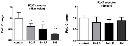 It was reported that the P2X7 receptor, expressed in immune cells, has a key role in the regulation of the inflammatory response leading to infection control [46]. To test whether the expression of the P2X7 receptor was affected by the treatment with the two peptides, mRNA expression levels were quantified in the skin lesions and the spleen of BALB/c mice infected with L. major and treated with 19-2.5, 19-4 LF (1 µg/mL) and PM (50 µM) or untreated (control). The P2X7 receptor was significantly downregulated in the skin lesions of the mice treated with 19-2.5 and 19-4LF (*, p < 0.05) and PM (**, p < 0.01), while no significant variation was detected in the spleen tissues with the same treatments (Figure 6).