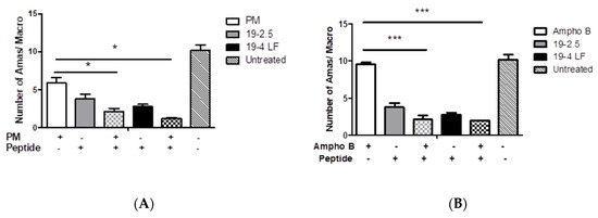 Lastly, the effect of both peptides in combination with the currently used anti-leishmanial drugs PM and Ampho B was studied. The results showed that the combination of 19-2.5 (1 µg/mL) or 19-4 LF (1 µg/mL) with PM (50 µM) dramatically reduced the number of amastigotes per macrophage from 6 (PM) to 2 or 1 (*, p < 0.05) when using 19-2.5 or 19-4LF, respectively (Figure 7).
