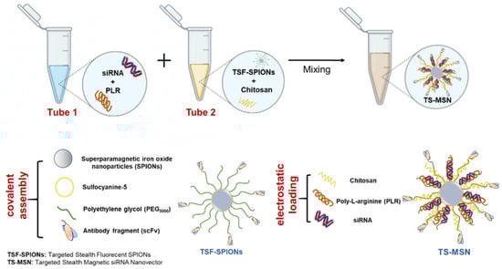 TS-MSN were formulated according to a previously developed protocol [8]. Briefly, siRNA was precomplexed with poly-L-arginine (tube 1) and targeted stealth fluorescent SPIONs (TSF-SPIONs) were mixed with chitosan (tube 2) in equal volumes before mixing the content of both tubes. All components were mixed in a well-defined ratio to produce self-assembled nanovectors through electrostatic interaction and form TS-MSN (Figure 1). The formulation process mainly depends on tuning the formulation parameters to assure the reproducibility of the physicochemical characteristics. Careful optimization of the charge ratio, the formulation components’ molar ratio, and the technique’s specificity, including micropipette mixing and vortexing, is an essential precaution during the formulation process of TS-MSN [19,30].