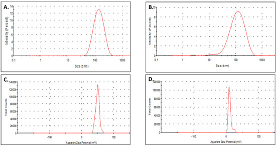 Representative size (A,B) and zeta potential (C,D) distribution for TS-MSNsiCtrl (A,C) and TS-MSNsiSurvivin (B,D). Mean values and SD are presented in Table 3.