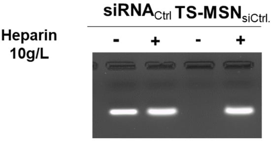 To check the loading of siRNA into the nanoparticles, a gel electrophoresis experiment based on heparin displacement was performed. An aqueous free/naked siRNA solution was used as a control, and samples of TS-MSN formulated with siRNA were incubated in the absence and presence of heparin (Figure 3). Heparin was added to displace the siRNA from the nanocarriers and hence to visualize the free de-complexed siRNA. As seen in Figure 3, free siRNA can interact with ethidium bromide and yield a fluorescent band. TS-MSN showed no free siRNA as no fluorescence was visible, indicating that siRNA was well-protected by TS-MSN from the intercalation of ethidium bromide. In previous work, the N/P ratio between siRNA and polymers was optimized in order to complex the entire amount of nucleic acids.