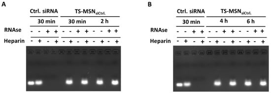 To check the further protection of siRNA in TS-MSN against enzymatic degradation, TS-MSN were incubated with RNAse A. Agarose gel electrophoresis was performed at different time points (Figure 4). Free, non-vectorized siRNA in solution served as a control. Samples of TS-MSN were incubated in the presence and absence of RNAse A and/or heparin for 30 min, 2, 4, and 6 h. As previously mentioned, heparin was added to displace siRNA from the nanocarriers and to visualize complexed siRNA. Naked siRNA was completely degraded within 30 min by RNAse A as no fluorescence band was seen (Figure 4A,B). Conversely, in the absence of RNAse A and heparin, no fluorescence intensity was seen for TS-MSN, indicating complete protection of siRNA in the developed nanovectors. Up to 6 h of incubation, in the presence and absence of RNAse A, lanes with heparin had the same fluorescence intensity of free siRNA for TS-MSN, indicating no siRNA degradation up to 6 h. The protection of the siRNA in the TS-MSN will allow siRNA to withstand the in vitro cellular conditions. Previous reports in our lab confirmed that TS-MSN internalized into different types of breast cancer cells within 4 h after incubation [12]. Furthermore, all those results demonstrated that the developed nano-system could fully complex and protect the loaded nucleic acid inside the nanovectors. This should predict the nanoparticles’ overall stability and contribute to their suitability for potential use via the parenteral route.