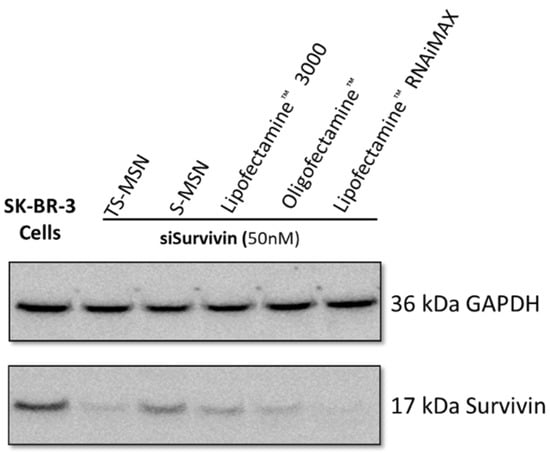Here, 3 × 105 or 5 × 105 of SK-BR-3 cells per well were seeded in a 6-well plate for protein extraction for further use in the Western blot experiment. For RNA extraction for qRT-PCR, 12-well plates were seeded with 3 × 105 cells 24 h before transfection. On the day of transfection, anti-Survivin siRNA and control (Ctrl.) siRNA were formulated in TS-MSN and diluted in OptiMEM™ serum-free medium for 4 h to obtain a 50 nM siRNA final concentration inside each well. Afterward, the SK-BR-3 culture medium was added (1:1 v/v). Oligofectamine™, Lipofectamine™ 3000, and Lipofectamine™ RNAiMAX (Invitrogen, Thermo Fisher Scientific (Paisley, UK)) were used as control transfection agents and were formulated according to their manufacturer’s recommendations with anti-Survivin siRNA to obtain the same siRNA concentrations. Cells were treated with the prepared suspensions and maintained in normal growth conditions for an additional 68 h. The level of Survivin protein and mRNA expressions were determined by Western blotting and qRT-PCR, respectively, as described below.
