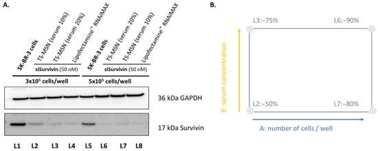 To ensure that the transfection conditions for Western blot experiments were optimal, a 2² factorial design was used. According to the previous studies obtained from different results in our lab, the period between the treatment and the analysis was fixed at 72 h to have enough time to inhibit the protein of interest (analysis time), and the duration of incubation with the nanovectors was 4 h in serum-free cell culture medium (treatment time). Non-treated SK-BR-3 cells and cells treated with the commercial transfection agent Lipofectamine™ RNAiMAX formulated with siSurvivin were used as a negative and positive control, respectively. After 4 h, the culture media was replaced by complete culture media supplemented with serum for the normal growth of the SK-BR-3 cells. The siSurvivin concentration was fixed at 50 nM. The analyzed factors were: (i) the number of cells deposited per well and (ii) the serum concentration in the culture medium between 4 and 72 h after cell transfection with our nanovectors. Western blot results (Figure 6A) showed that all TS-MSN formulations could induce Survivin protein downregulation but to different degrees. To facilitate the interpretation of the DOE experiment, the inhibition of Survivin expression was quantified visually from the WB images (Figure 6B).