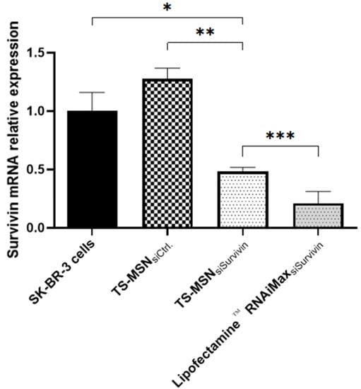 qRT-PCR results of Survivin-mRNA relative expression on SK-BR-3 cells treated with TS-MSN and Lipofectamine™ RNAiMAX vectorized with control and anti-Survivin siRNA (50 nM). Data are presented as mean ± SD. * p < 0.05, ** p < 0.01, *** p < 0.001 (p-value ≤ 0.05 is considered statistically significant). TS-MSN: Targeted stealth magnetic siRNA nanovectors.