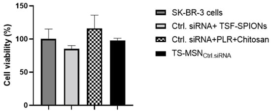 Cell viability of the SK-BR-3 cell line treated either with a mixture of control (Ctrl.) siRNA and TSF-SPIONs, a mixture of Ctrl. siRNA, poly-l-arginine (PLR), and chitosan, or TS-MSNctrl. siRNA. Data are presented as the mean ± SD. TS-MSN: Targeted stealth magnetic siRNA nanovectors, TSF-SPIONs: targeted stealth fluorescent superparamagnetic iron oxide nanoparticles.