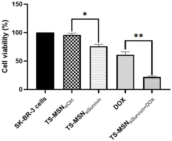 SK-BR-3 cells’ viability after treatment with the combination of TS-MSN and DOX. TS-MSN were formulated either with Ctrl. siRNA or anti-Survivin siRNA and were incubated at a concentration of 50 nM for 72 h. DOX has been added 24 h post-TS-MSN treatment at an IC50 concentration of 48 h (0.5 µM). Data are presented as the mean ± SD. * p = 0.0015, ** p = 0.0001 (both p-values were statistically significant as they are <0.05). TS-MSN: Targeted stealth magnetic siRNA nanovectors, DOX: Doxorubicin.