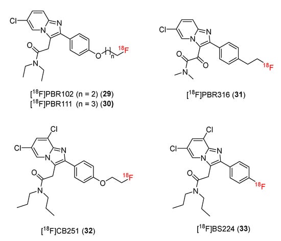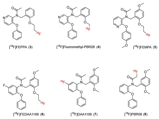 In 2008, Pike and co-workers reported on [11C]PBR28 (N-(2-[11C]methoxybenzyl)-N-(4-phenoxypyridin-3-yl)acetamide), a potential second-generation TSPO radioligand based on a phenoxyarylacetamide structure. Basically, the ring opening of the diazepine ring of Ro5-4864 will form high-affinity PBR ligands, including DAA1106. Then, with a pyridine ring replacing one of the benzene rings of DAA1106, the derivatives of phenoxyarylacetamide PBR are generated. This method produced a series of compounds with reduced lipophilicity but still retaining properties such as high affinity for PBR and blood–brain barrier penetration ability [124]. Subsequent studies developed new 18F-radiolabeled ligands by replacing the 11C on PBR28 with 18F (Figure 2).