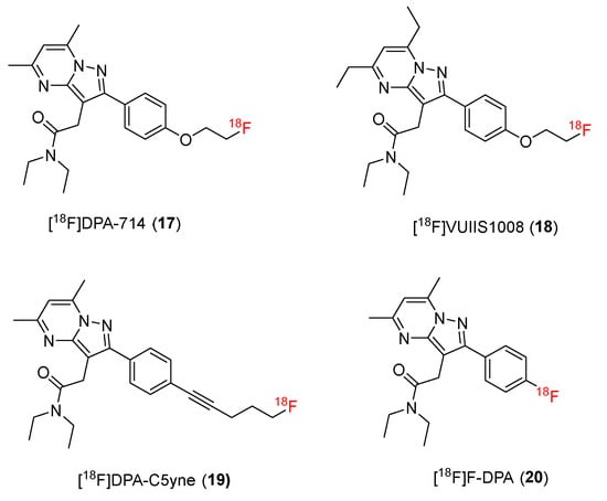 Pyrazolopyrimidine compounds were developed based on the basic pyrazolo [1,5-a] pyrimidine skeleton, including a hetero bicyclic compound containing a pyrazole fused to a pyrimidine ring. This structure has been shown to interact with a wide variety of biological targets, making it a privileged scaffold in pharmaceutical chemistry [131]. Compounds with a pyrazolopyrimidine moiety have proven to have strong affinity for TSPO. N,N-Diethyl-2-[2-(4-methoxyphenyl)-5,7-dimethyl-pyrazolo [1,5-a]pyrimidin-3-yl]-acetamide (DPA-713) is a potential TSPO ligand [132]. DPA-713 has a greater affinity (Ki = 4.7 nM) for TSPO compared with PK11195 (Ki = 9.3 nM) and is significantly more selective for TSPO when compared with the central benzodiazepine receptor (CBR), which has a Ki > 10,000 nM. Subsequent studies of 11C-radiolabeling of DPA-713 produced a useful PET tracer, which has been used in several preclinical and clinical studies [132,133]. Based on positive results, new 18F-radiolabeled TSPO ligands, including [18F]DPA714 and [18F]DPA, were developed (Figure 3).