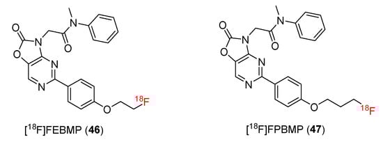 Later, Lee and co-workers carried out a comparison study between [18F]fluoromethyl-PBR28 and its 2H derivates ([18F]fluoromethyl-PBR28-d2) [126]. The results showed that the properties of [18F]fluoromethyl-PBR28-d2 were similar to those of [18F]fluoromethyl-PBR28 in terms of in vitro binding affinity and lipophilicity. However, the uptake of [18F]fluoromethyl-PBR28-d2 was reduced in the skull and femur compared with [18F]fluoromethyl-PBR28 (1.5% ± 1.2% versus 4.1% ± 1.7% of injected dose (ID)/g at 2 h post-injection) and cleared more rapidly in the contralateral area, indicating an improved target-to-background ratio (approximately 3.8-fold for [18F]fluoromethyl-PBR28-d2 versus 3.0-fold for [18F]fluoromethyl-PBR28 at 30 min post-injection). Several other preclinical studies also concluded that the radiotracer [18F]fluoromethyl-PBR28 is a sensitive tool for diagnosing neurological diseases in animal models [46,127,128,129].