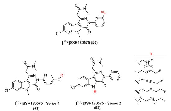 | Pyridazinoindoles | [18F]SSR180575 | Ki = 1.19 ± 0.05 nM | Rat | Lack of preclinical and clinical studies | [106,107] |