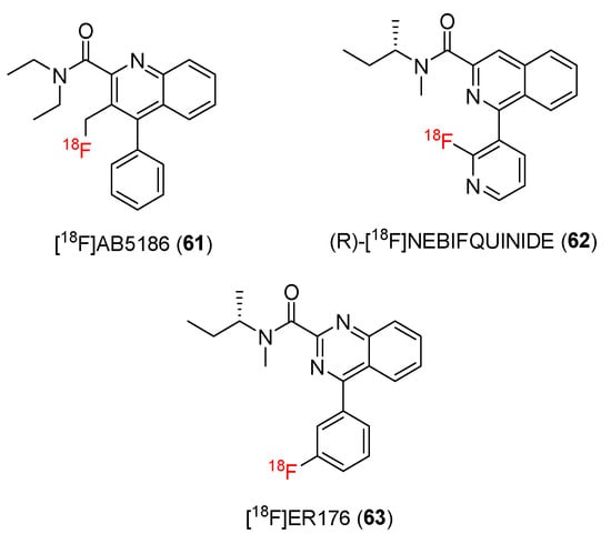 | Quinazoline carboxamide | [18F]ER176 | Ki = 3,10 ± 0,30 nM Log D = 3.55 ± 0.02 | Rats | High lipophilicity Lack of preclinical and clinical studies | [122,123] |