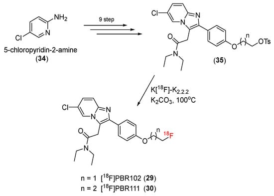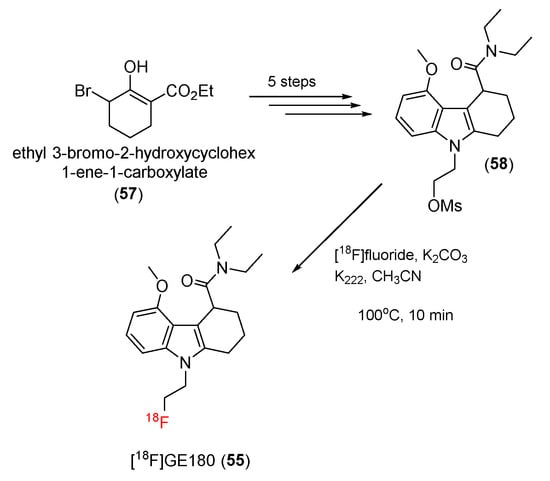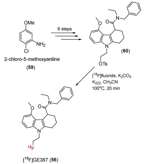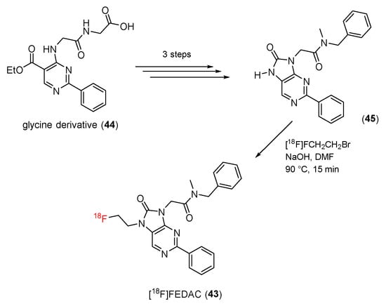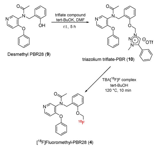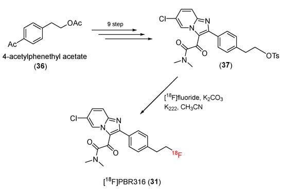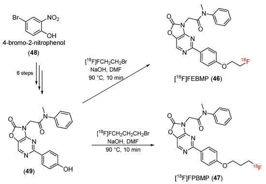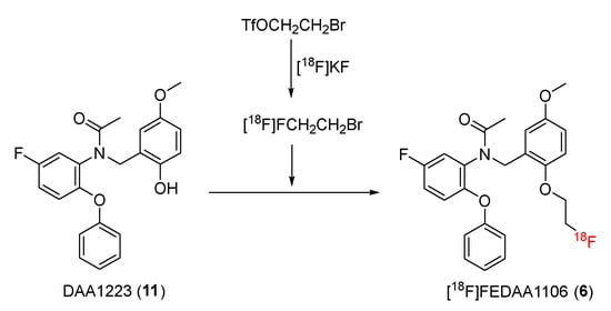 In 2003, Suzuki and co-workers reported that the synthesis of N-(5-fluoro-2-phenoxyphenyl)-N-(2-[18F]fluoroethyl-5-methoxybenzyl)acetamide ([18F]FEDAA1106) (6) could be achieved through a reaction between a desmethyl substrate N-(5-fluoro-2-phenoxyphenyl)-N-(2-hydroxy-5-methoxybenzyl) acetamide (DAA1123) (11) and the respective fluoroethylated intermediates, which were synthesized by treating [18F]F− with CH2I2 or 2-bromoethyl triflate (BrCH2Ch2OTf) with 75% yield (Scheme 2) [51]. After high-performance liquid chromatography (HPLC) purification, the radiochemical purity of the 18F-radiolabeled ligand was >98%, and the activity was >120 GBq/μmol. After maintaining it at 25 °C for 4 h, the radiochemical purities of [18F]FEDAA1106 were still >95% [51].
