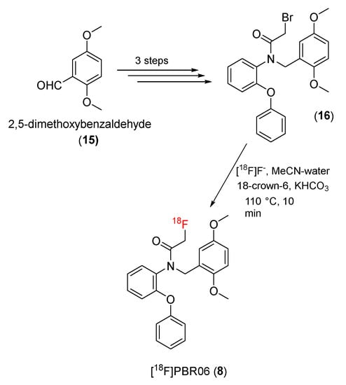 18F-N-fluoroacetyl-N-(2,5-dimethoxybenzyl)-2-phenoxyaniline ([18F]PBR06) (8) is another potent PET tracer. [18F]PBR06 (8) was synthesized from 2,5-dimethoxybenzaldehyde as a starting material by Pike and co-workers in 2009 [130]. A bromo precursor (16) was synthesized from 2,5-dimethoxybenzaldehyde (15) in three synthetic steps and then radiolabeled with 18F to yield [18F]PBR06 (8) (Scheme 4).