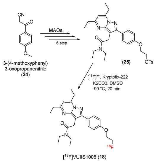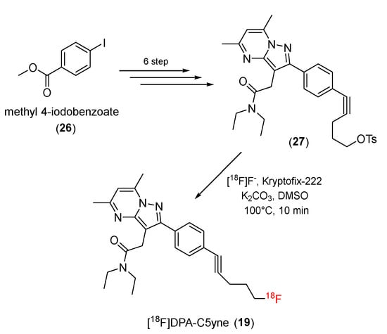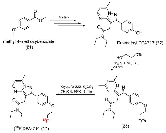[18F]DPA-714 (17) is a 18F-labeled compound with a pyrazolopyrimidine group, as reported in 2008 by Kassiou and co-workers. [18F]DPA-714 (17) was synthesized by a seven-step process (Scheme 5) [66]. First, desmethyl DPA713 (22) was prepared in five steps from methyl 4-methoxylbenzoate (21) [133]. The treatment of desmethyl DPA713 (22) with toluene-4-sulfonic acid 2-hydroxy-ethyl ester and triphenylphosphine then gave a tosylate precursor (23). Finally, after 18F-radiolabeling process, [18F]DPA-714 (17) was generated with a 16% radiochemical yield and a specific activity of 270 GBq/μmol. DPA-714 displayed an affinity for TSPO of Ki = 7.0 nM, which was higher than that of PK11195 (Ki = 9.3 nM). The log D value for DPA-714 was 2.44, which was similar to that for DPA713 and less than that for PK11195 (3.35). A PET study using rats with quinolinic acid lesions reported increased uptake in lesion-containing areas of the brain, indicating that [18F]DPA-714 can cross the blood–brain barrier. Biodistribution and specificity studies of baboons confirmed that PK11195 also inhibited binding of [18F]DPA-714 to TSPO in baboon brains, indicating that [18F]DPA-714 can bind specifically to TSPO [66].
