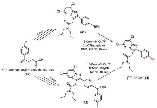 In 2007, Zhang and co-workers proposed a new synthetic method using intermediate diphenyl iodonium salt to produce a new TSPO ligand, N-(2,5-dimethoxybenzyl)-N-(5-[18F]fluoro-2-phenoxyphenyl)acetamide ([18F]DAA1106) (7). However, [18F]DAA1106 could not be prepared through this procedure for clinical use due to the instability of the diphenyl iodonium precursor and its unsuitability for automated manufacturing [56].