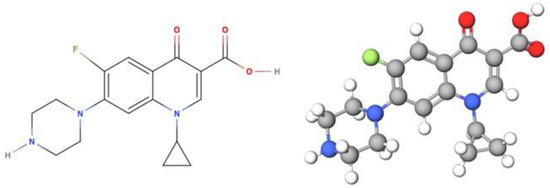 Ciprofloxacin (CIP) is an antibiotic in the group of second generation quinolones, also known as quinoline derivatives (Figure 1). It exerts bactericide activity by inhibiting topoisomerases II and IV and presents a broad spectrum of action against Gram-positive and Gram-negative bacteria and mycobacteria. For these reasons, it is one of the most widely used fluoroquinolones and is described by the World Health Organization as an essential drug for a basic health system [1,2,3].