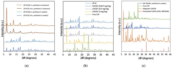 X-ray Diffraction patterns of (a) ZIF-8 with different synthesis conditions; (b) ZIF-8 and encapsulated CIP in ZIF-8 at different loadings; and (c) magnetic CIP/ZIF material.