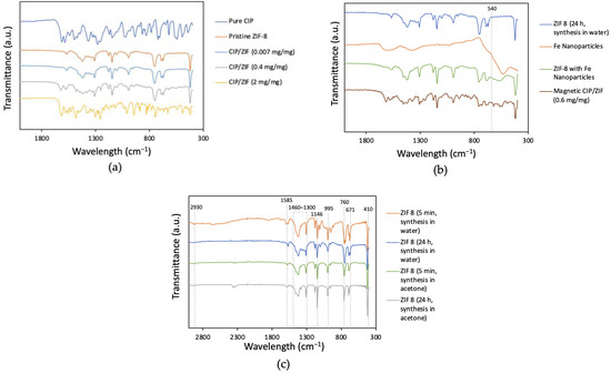 FT-IR spectra of (a) ZIF-8 and encapsulated CIP in ZIF-8 at different loadings; (b) magnetic CIP/ZIF material and Fe NP; and (c) ZIF-8 with different synthesis conditions.