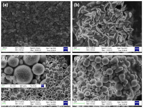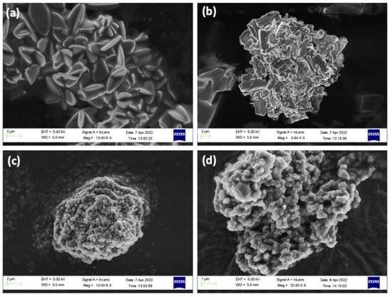 SEM images of (a) ZIF-8 (5 min, synthesis in water); (b) ZIF-8 (24 h, synthesis in water); (c) ZIF-8 (5 min, synthesis in acetone); and (d) ZIF-8 (24 h, synthesis in acetone).